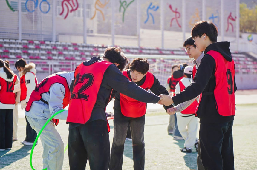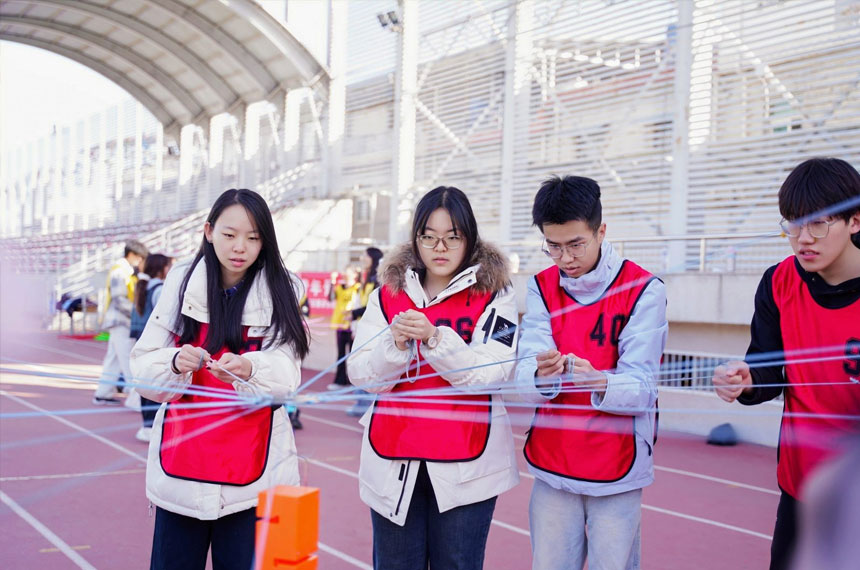 若干名队员作为一个接力赛小分队,要求参赛队员互相配合把一个大彩球高举过肩部,从起 点跑到终点,然后换下一个接力小分队,接力赛总用时最短的小组名次前列